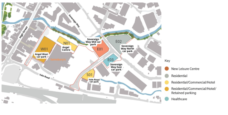 This is the land surrounding and including the Angel Centre, and currently contains car parks. It does include the car park behind the High Street, but does not include the car park to the east of Sainsbury’s.